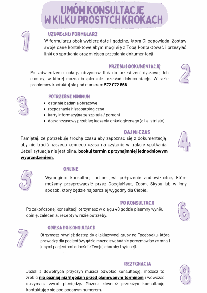 Pacjent zobowiązany jest do dostarczenia dokumentacji medycznej w formie elektronicznej najpóźniej 24 godziny przed zaplanowaną konsultacją. Dokumentację należy udostępnić na dysku lub chmurze, do której dostęp zostanie udostępniony wraz z linkiem do spotkania. Alternatywnie, pacjent może przesłać dokumentację e-mailowo, jeśli taki sposób został uzgodniony.Odwołanie konsultacji i zwrot pieniędzy